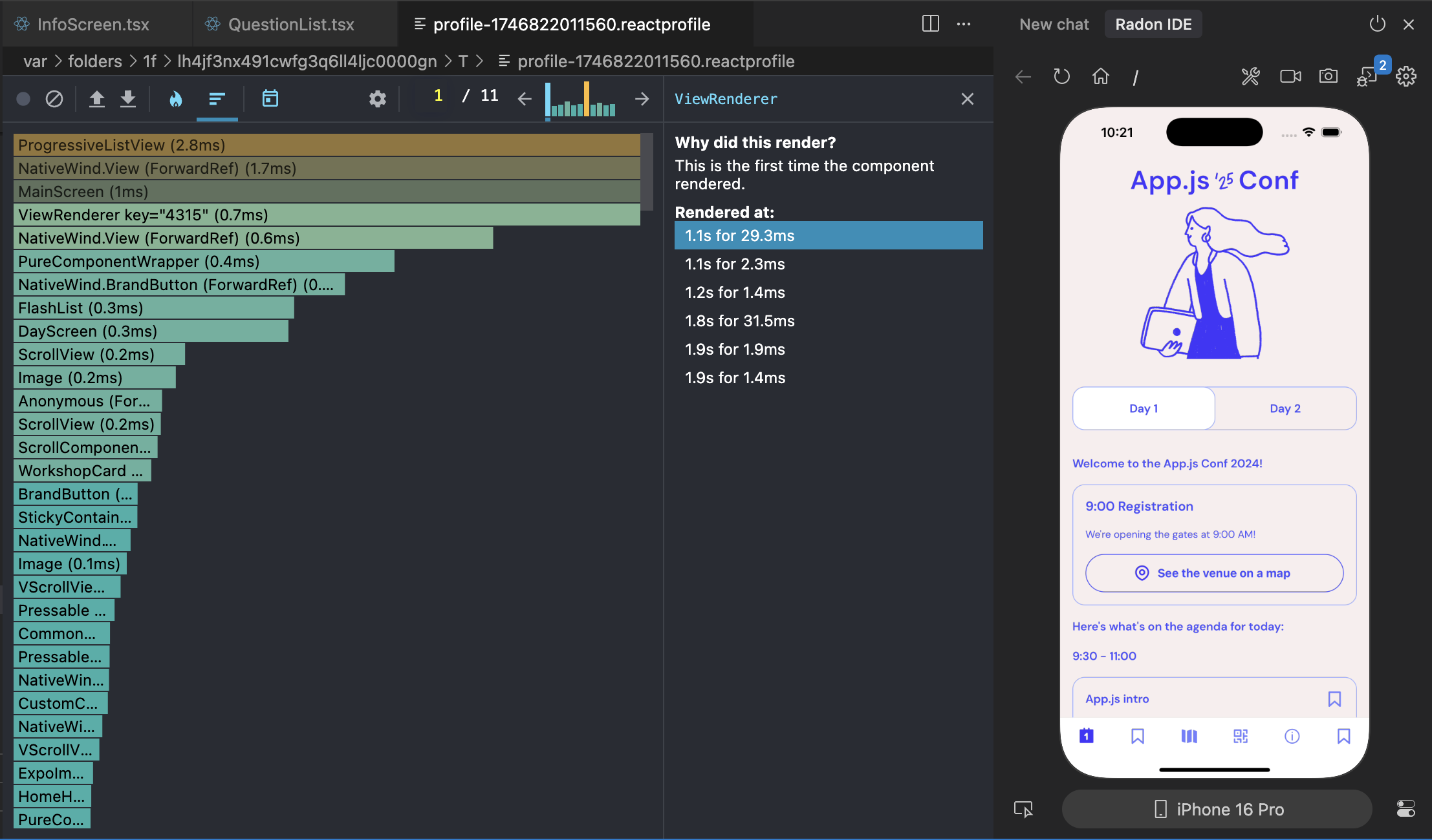 Once the profile is stopped, Radon saves the profile into a temporary location under .reactprofile extension, and presents a new editor that uses the React Devtools UI to render the profile analysis tool: